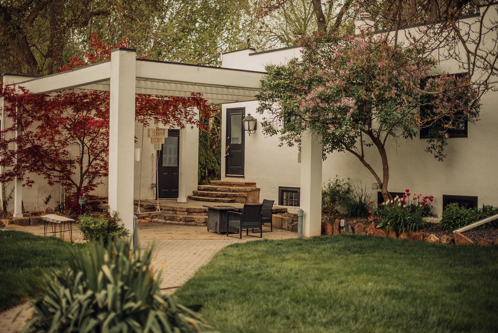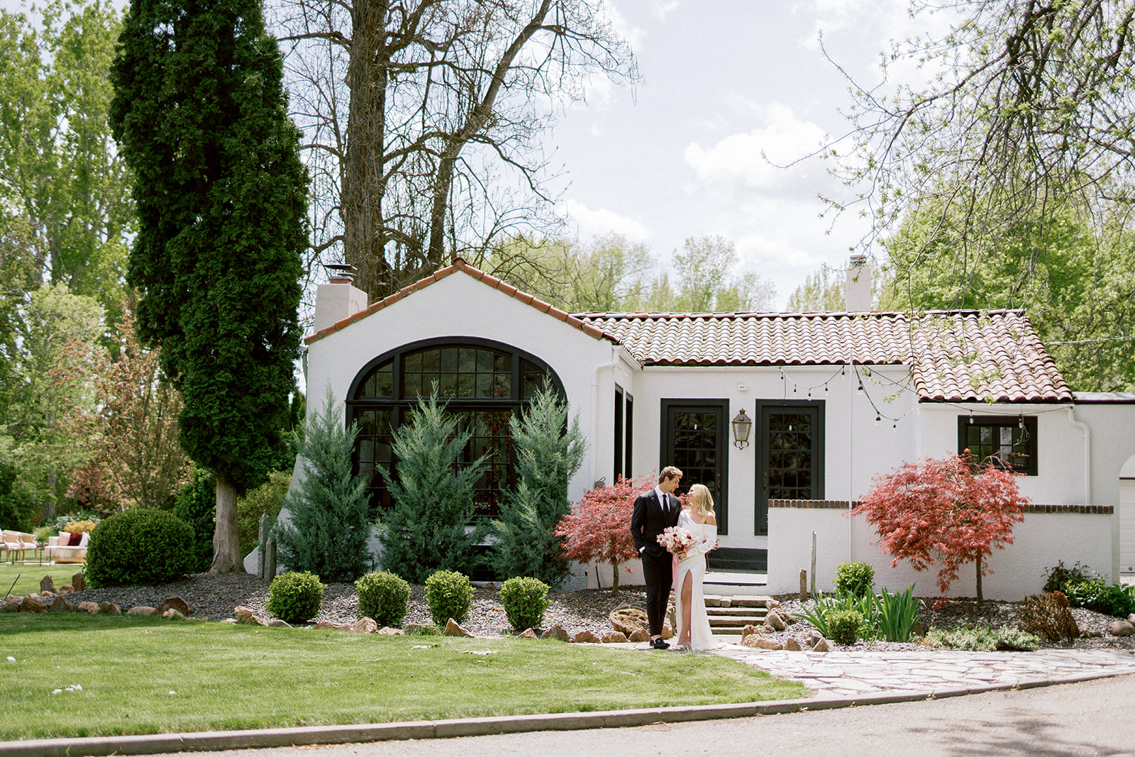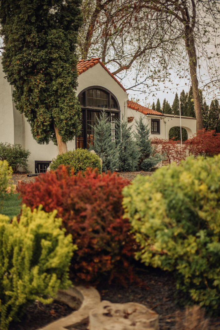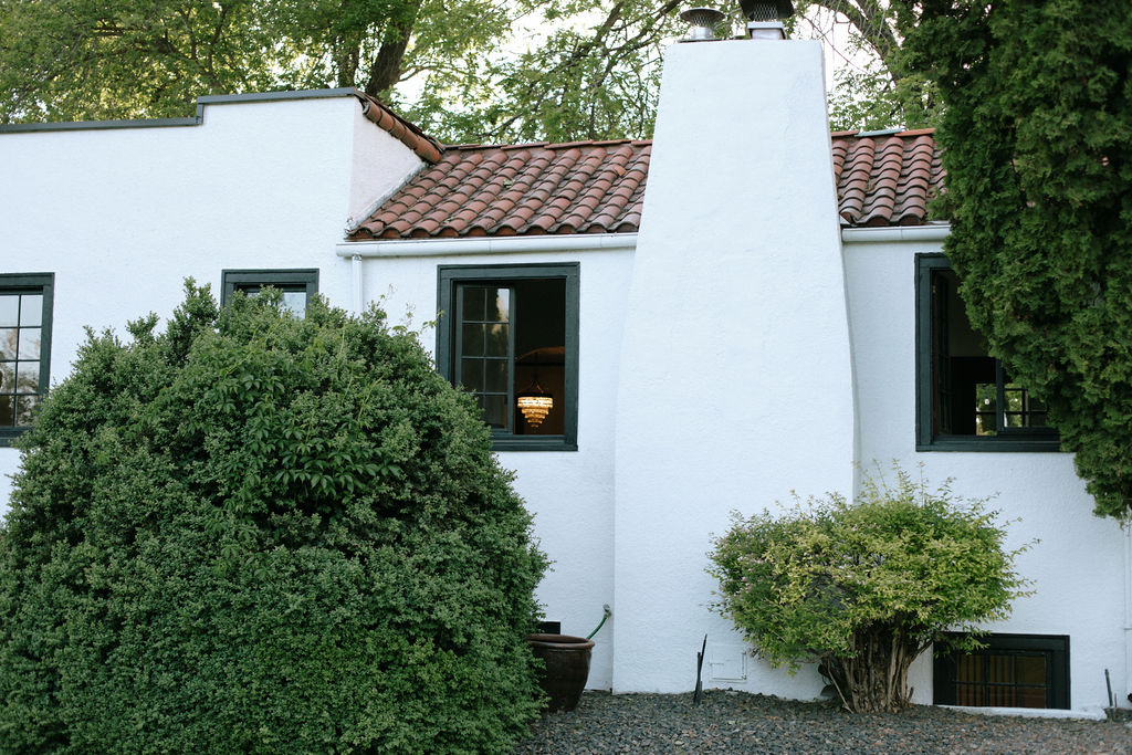 The 2,000 square foot Spanish revival cottage, built in 1930, is nestled under towering elm, maple, and cypress that are nearly 100 years old. Acres of verdant lawns and beds overgrown with iris, rose, and yucca, make a perfect setting for your outdoor/indoor event. Situated in the back garden is a white canopy draped in white silks, bejeweled with crystal chandeliers, and strung with golden lights. A whitewashed barn provides a rustic backdrop for photos.